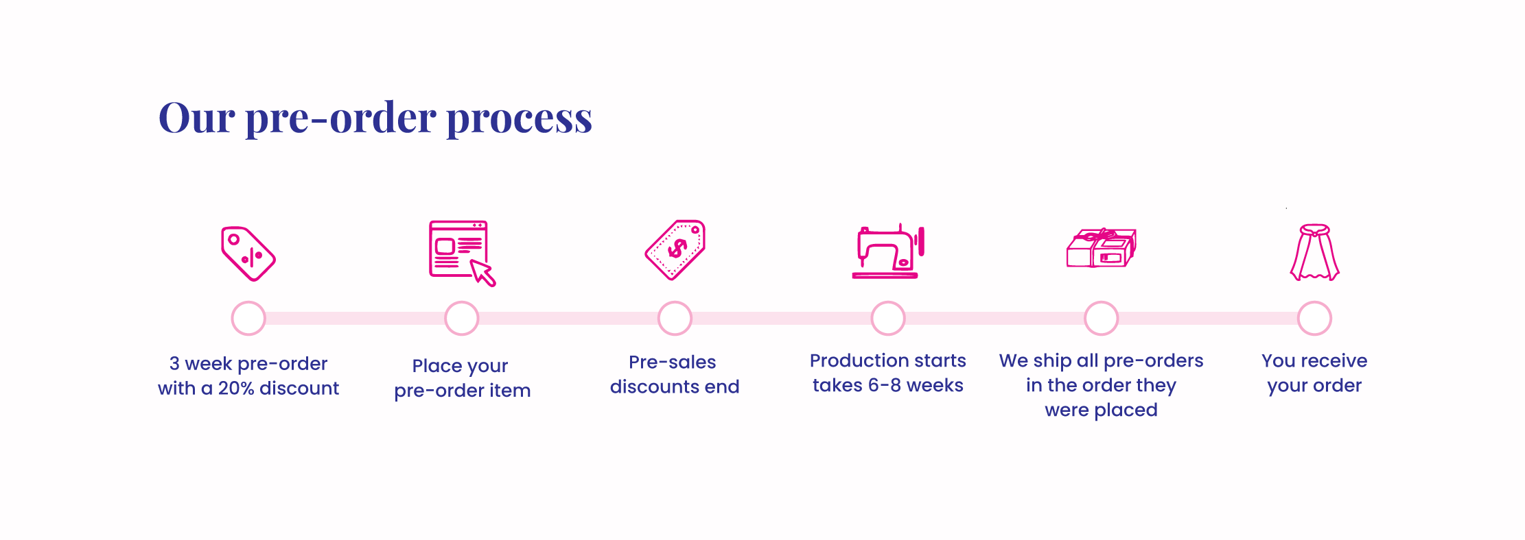 Our pre-order system helps prevent overproduction in fashion. New designs are available for pre-order at a discounted price for 3 weeks, with production determined by pre-order numbers. Orders are fulfilled on a first-come, first-serve basis within 6-8 weeks. Thank you for supporting our slow fashion brand and for your patience as we handcraft each piece with attention to detail.